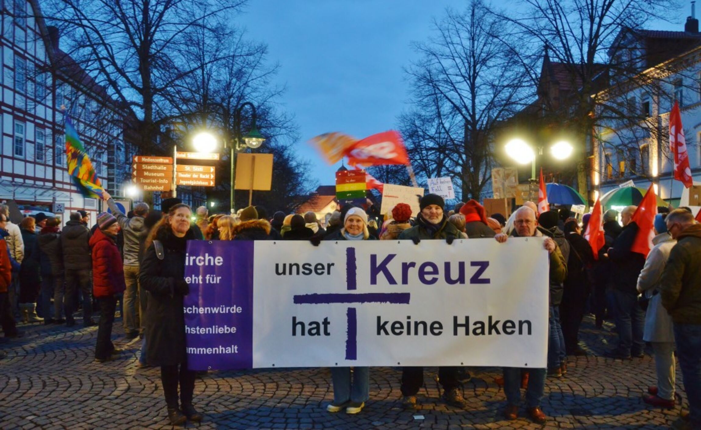 Zuletzt ergriff Superintendentin Stephanie von Lingen das Wort, die vor allem dazu einlud, nun gemeinsam weiter nach Northeim zu fahren, um beim dortigen Protest mit dem Banner „Unser Kreuz hat keine Haken“ ebenfalls zu zeigen, was viele angesichts des Erstarkens der AfD fürchten und vor allem um auszudrücken, wie bunt die Region ist und wie viele unterschiedliche Menschen zusammenhalten, weil sie diese bunte Zivilgesellschaft bewahren wollen.