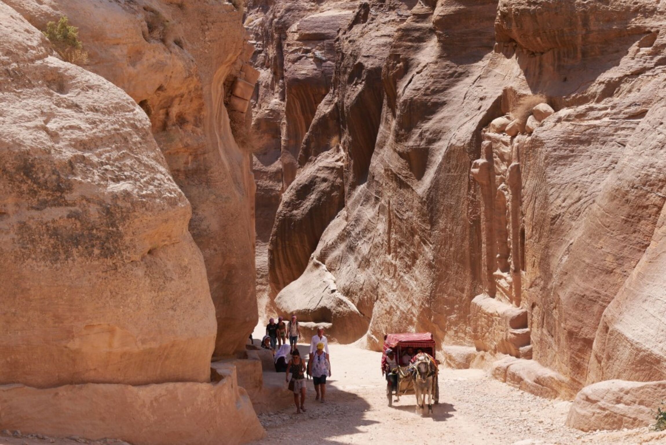 Petra war die Hauptstadt des von 200 v. Chr. bis 106 n. Chr. bestehenden Nabatäerreichs und liegt in einem von steilen Bergen umgebenen Talkessel, der durch eine Siq genannte 1,3 km lange Erdspalte (s. Bild) zugänglich ist. Seine in den Felsen geschlagenen Bauten lösen Erstaunen aus.