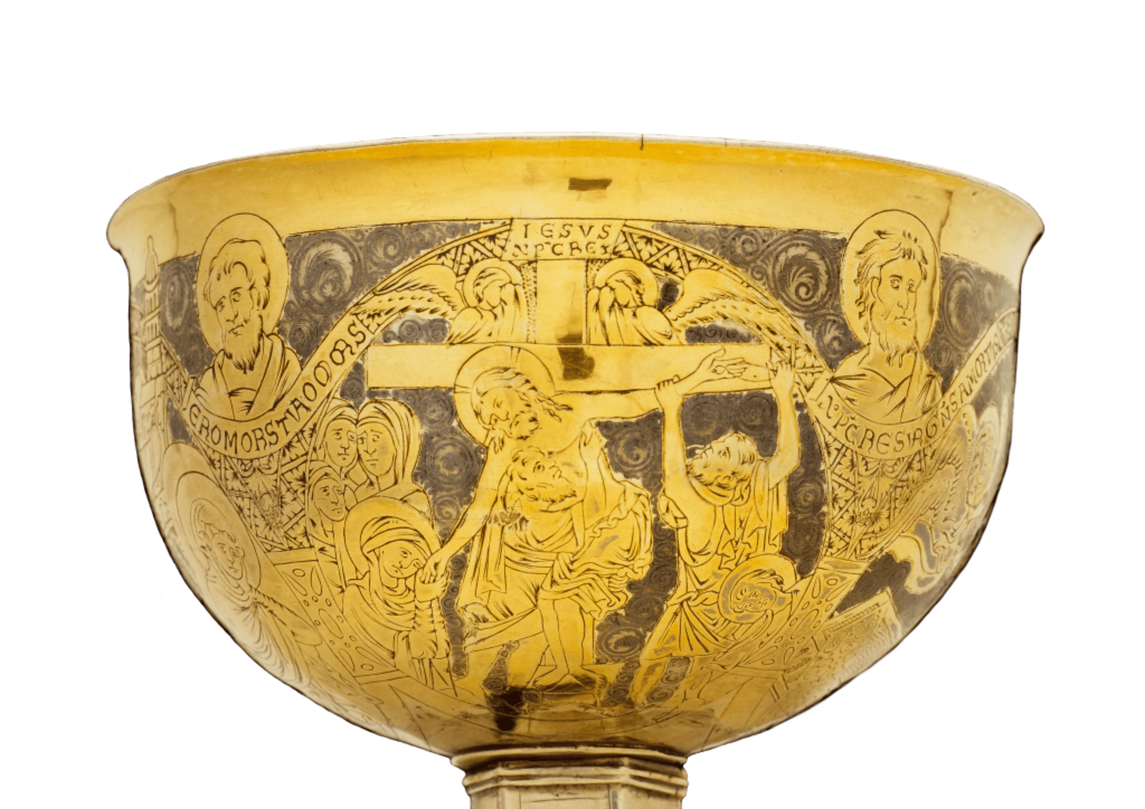 „Zwei Medaillons auf dem Kelch zeigen Szenen aus der Passionsgeschichte“, erklärt Pastor Jan Höffker: „Zu sehen sind Menschen unter dem Kreuz, an dem Jesus stirbt. Maria, die trauernde Mutter, umgreift die Hände ihres toten Sohnes. Sie ist als frühe Pietà dargestellt. Zwei ältere Männer nehmen den Toten vom Kreuz, ziehen ihm die Nägel aus den Wunden und hüllen den Leib in Tücher – eine letzte Geste der Würde, die dem Toten gebührt.“ Sie alle sind von einem Heiligenschein umkränzt und gut erkennbar. Eine Besonderheit dieser Darstellung: Über dem Kreuzes weinen die Engel um den Christus, dessen Haupt auch im Tod noch von einem Heiligenschein umkränzt ist.