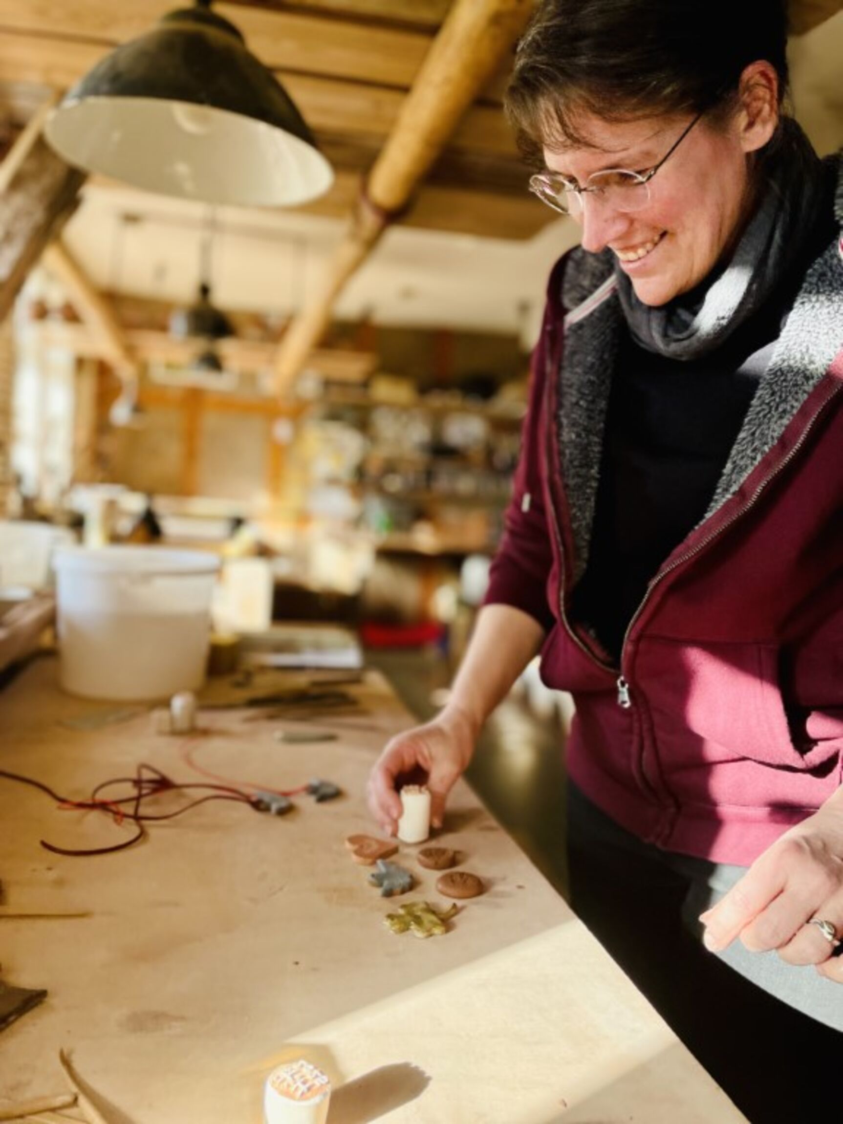 „Jeder Anhänger ist ein Einzelstück und von Hand gefertigt, keiner gleicht dem anderen“, berichtet Töpferin Janne Klett-Drechsel: „Und am Ostermorgen haben wir sie dann in unserem Ofen endlich gebrannt“, berichtet Janne Klett-Drechsel erleichtert. Tatsächlich passten alle 2400 Anhänger übereinander geschichtet in den Töpferofen, der in der aufgehenden Sonne des Ostermorgens zum Teil mit Solarenergie betrieben wurde.