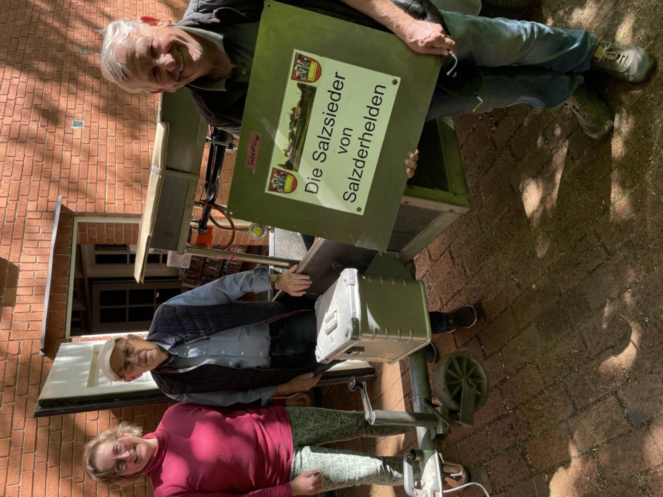 Die Salzsiedepfanne aus Salzderhelden ist auf dem Weg zum Kirchentag in Hannover. Denn Jörg Meister (r.), und Karl-Heinz Wessel werden beim "Abend der Begegnung" am Mittwoch zusammen mit den der Sül-becker Saline die Kunst des Salzsiedens demonstrieren. Dies freut die Kirchentagsbeauftragte des Kirchenkreises Leine-Solling, Pastorin Anne-gret Kröger (l.). Außerdem werden Pavillons, Tische und Getränke verla-den. Mit dabei: 300 Tonanhänger aus Fredelsloh mit der Kirchentagslo-sung zur „Verteilung mit Segen“.
