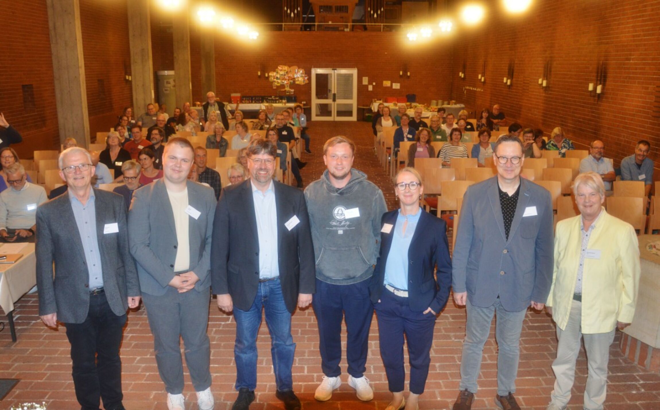 Foto Christian Dolle: Die Kandidatinnen und Kandidaten bei der Vorstellung zur Wahl in der Apostelkirche in Northeim. V. li. Dr.-Ing. Uwe Brinkmann, Harzer Land (Pastor und stellv. Sup.), Eduard Hillgert, Göttingen-Münden (Schüler), Daniel Küchenmeister, Göttingen-Münden (Pastor), Maximilian Hermann Freitag, Leine-Solling (Azubi), Marit Günther-Menzel, Göttingen-Münden (Superintendentin), Martin Böker, Holzminden-Bodenwerder (Rentner), Ulrike Schmidt-Glawatz (Rechtsanwältin und Notarin (ich glaube inzwischen i.R.), Wahlausschussvorsitzende)
