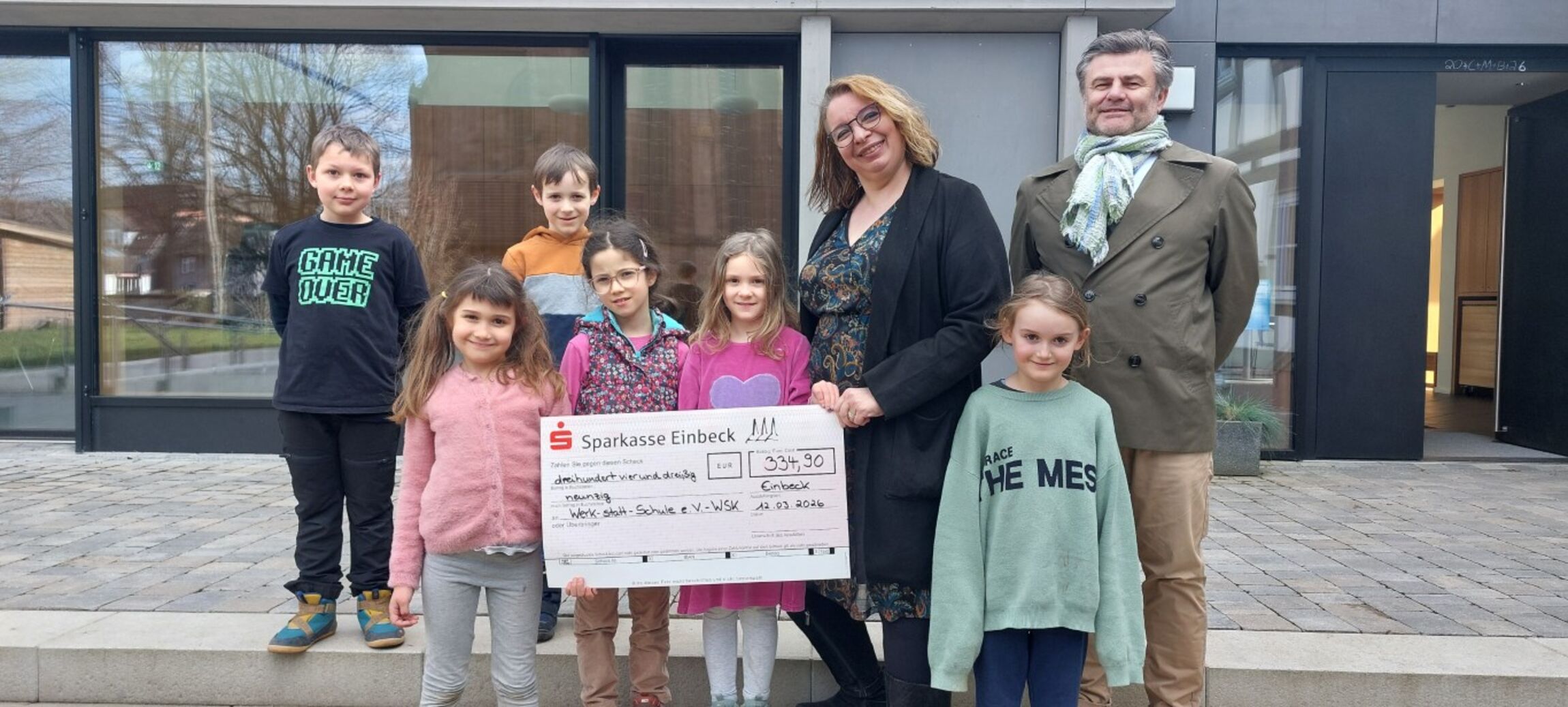 Durch das Basteln von Buttons mit Friedenssymbolen sind insgesamt 334,90 Euro zusammengekommen. Die jüngsten Kinderchor-Kinder haben ein paar Tage nach dem Aufführungswochenende einen symbolischen Scheck an Antje Stegemann und Maik Schwartau von der Werkstatt-Schule überreicht.
